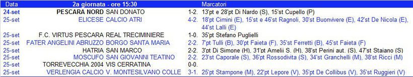 Il poker dell'Elicese al Calcio Atri vale il primato solitario in classifica. Il Borgo S.Maria si vede raggiungere nel finale dalla Fater. Il San Marco, sempre nei minuti di recupero, acciuffa l'Hatria con un gol di Staiano. Il San Giovanni fugge con Caporale e Rossodivita, il Moscufo lo raggiunge nella ripresa. Senza reti Torrevecchia-Vis Cerratina, il primo 0-0 del campioato.