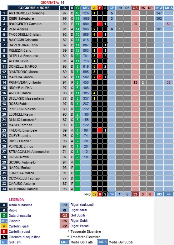 Classifica del GIRONE di ANDATA ordinata per minuti giocati (MG):