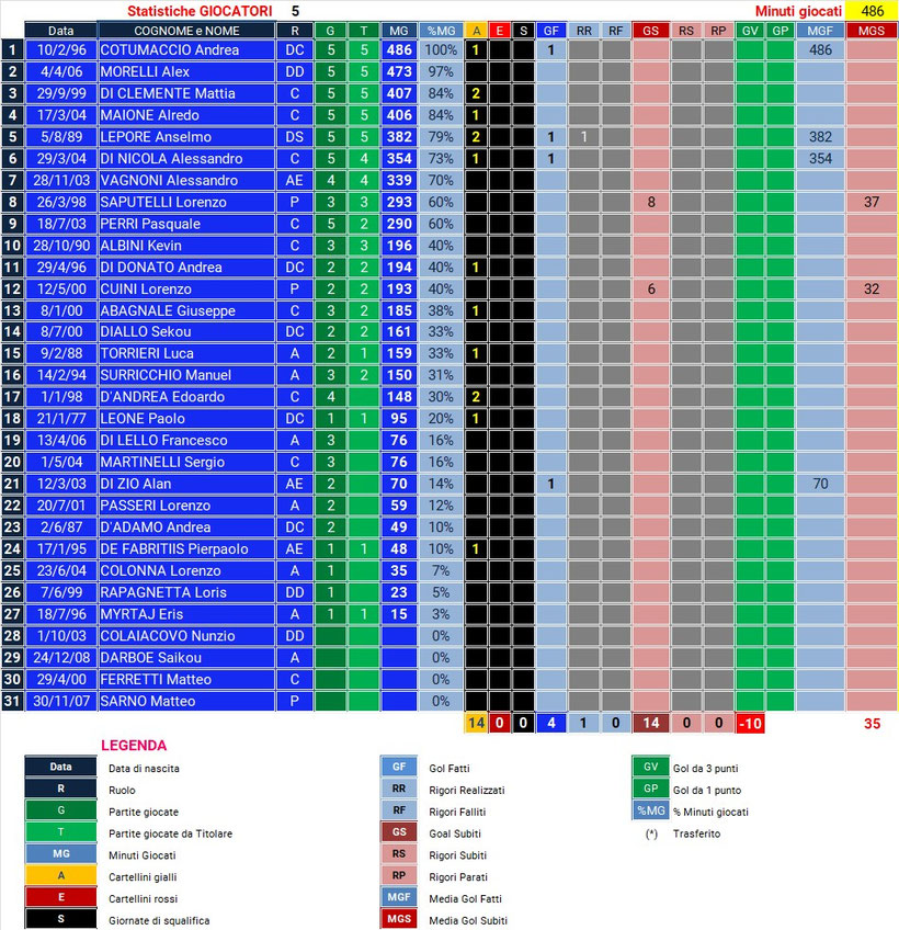 Dopo 486’ di campionato tutti i giocatori disponibili (27) sono stati impiegati almeno una volta, di cui solo Andrea Cotumaccio sempre in campo.
