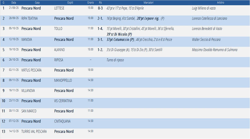 Attualmente la Pescara Nord occupa l’ultimo posto in classifica con la seconda peggior difesa (14), il peggior attacco del girone C (4) e la peggior differenza reti (-10)